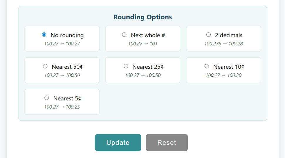 - Multiple rounding options: next number, nearest 50, 25, 10, or 5 cents